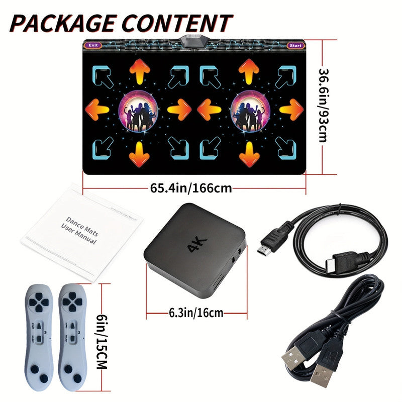 The 2-Player Dance Mat Game brings energetic fun and fitness to your living room. With HD visuals and responsive motion sensor controllers, itâ€s designed for kids and adults alike to enjoy movement and music together. Whether you're hosting family game night or getting your steps in, the plug-and-play USB setup makes it effortless to start. Refer to the image for product dimensions.