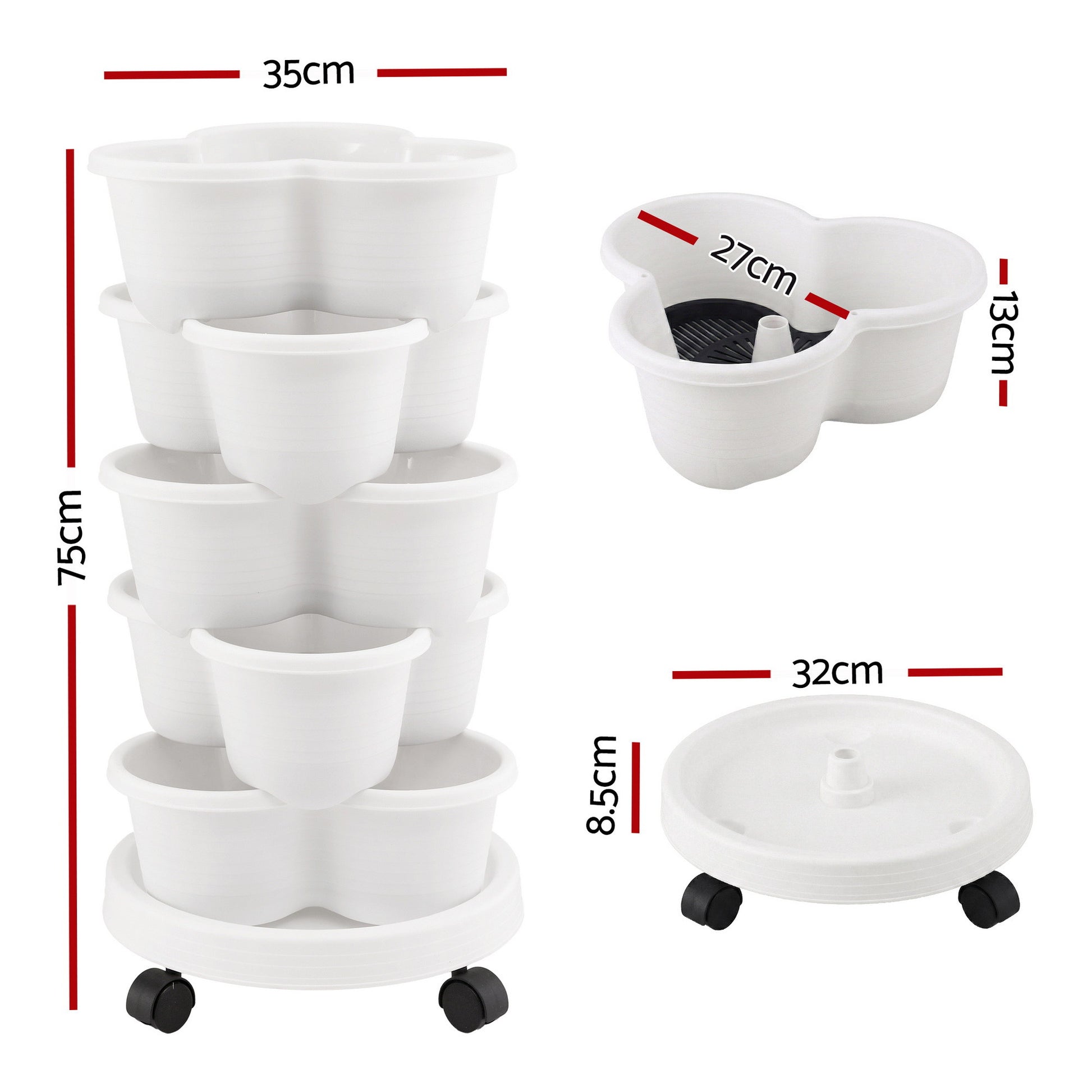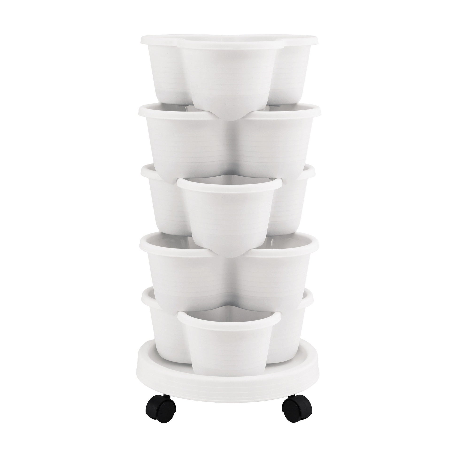 Green Fingers 5 Tier Vertical Garden Planter, Stackable Planters with Wheels, White, Garden Bed, Garden Tower Indoor Outdoor, Auto Drainage System, for Strawberries, Herbs, Flowers, Vegetables