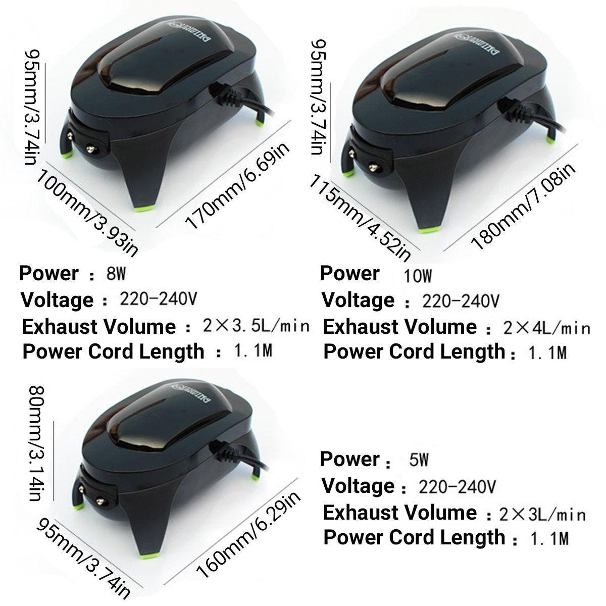 Upgrade your aquarium setup with this adjustable, energy-saving fish tank oxygen pump. Perfect for maintaining a healthy environment for your aquatic pets, this aerator ensures efficient oxygen circulation with minimal power consumption. Available in three different power options (5W, 8W, and 10W), this oxygen pump is designed to suit various tank sizes. Built with durability and functionality in mind, it features a low-noise motor, adjustable airflow, and is constructed with quality materials for long-lasting use. Whether you have a small home aquarium or a larger fish tank, this pump will help your fish thrive.