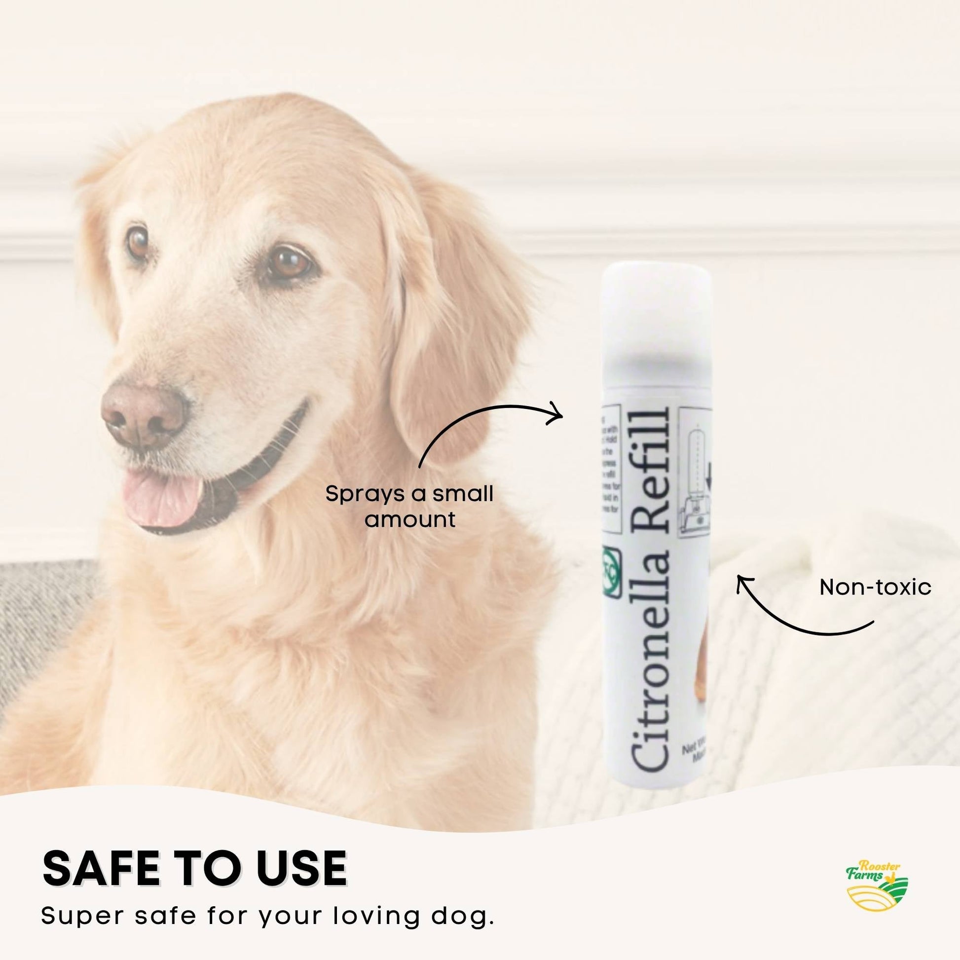 The Rooster Farms Citronella Bark Collar offers a safe and gentle way to help reduce barking. It uses citronella spray and sound to interrupt barking with automatic or sound activated modes for indoor or outdoor use. A humane alternative to other collars, using a soft citronella mist for stress free training. Note: Training aid only. Do not use on puppies under 6 months or for long periods. Wipe clean, do not submerge.