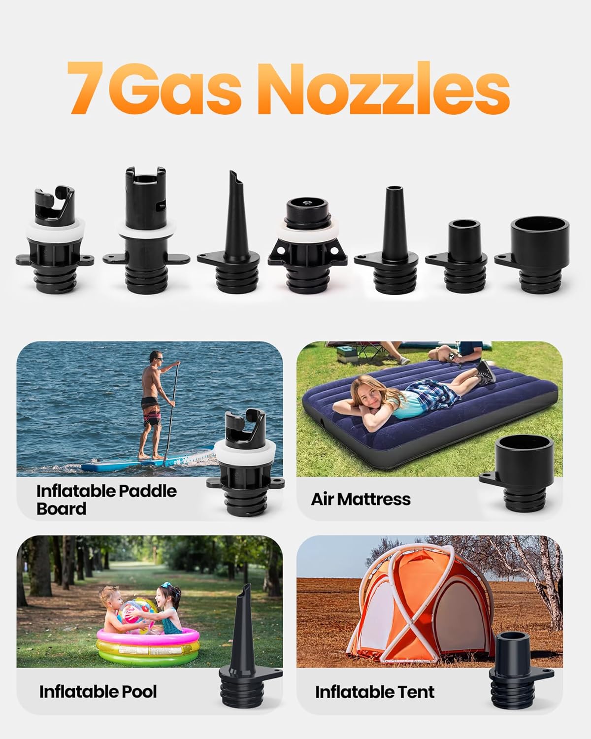 Come with 8 nozzles, compatible for paddle boards, rubber boats, canoes, kayaks, dinghy, floats, rafts, water sports pools, inflatable tents, pool platforms, and more, which could satisfied with your most need.