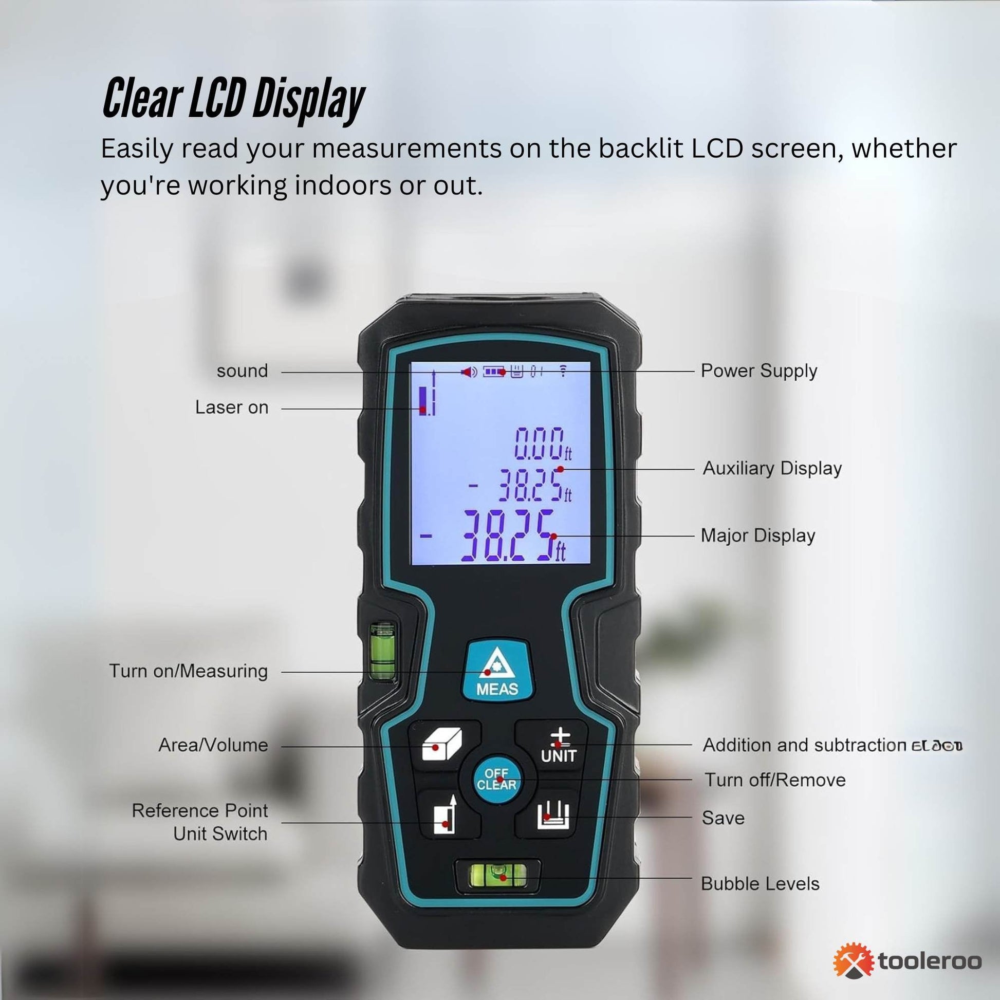 - Clear LCD Display - Easily read your measurements on the backlit LCD screen, whether you're working indoors or out.